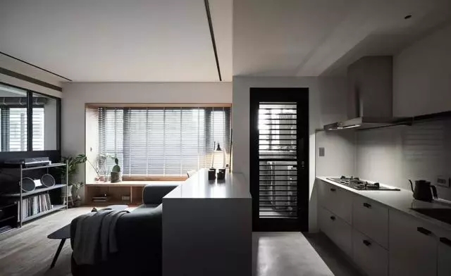 整個(gè)空間做成開(kāi)放式的格局,基本就是黑色、白色、灰色、原木等,再無(wú)其他艷麗的色彩了。入戶玄關(guān)地面開(kāi)始就做水泥自流平地面,從而與客廳臥室直接過(guò)渡成地板。