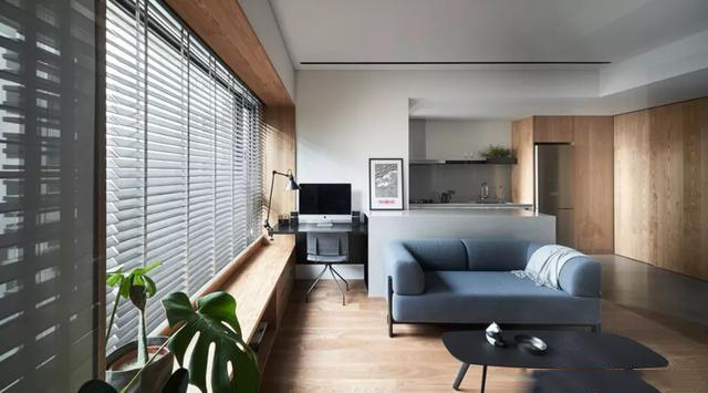 客廳空間不算大,飄窗臺(tái)直接都打造成木柜子,做舊藍(lán)的北歐風(fēng)格沙發(fā)很簡單,看著就很時(shí)尚。