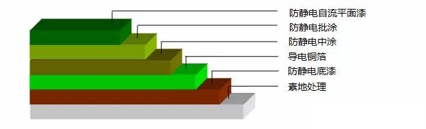 在環(huán)氧中涂上面按照4*4m的規(guī)格鋪裝貼地銅泊,然后廠房四個角用銅泊線接通在地下的導電線路,以上工序的效果為把車間產生靜電導向地下泄漏。