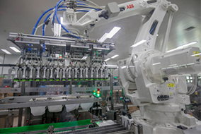 機(jī)器人裝箱機(jī)采用機(jī)器人裝箱,通過更換夾具,使其適合不同包裝物的裝箱需求,極大的提高了設(shè)備的靈活性、穩(wěn)定性和可靠性。